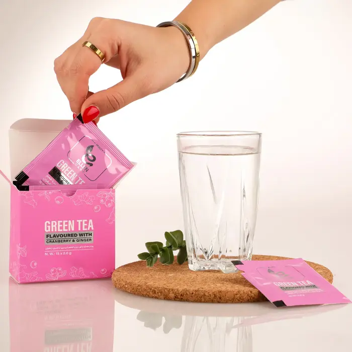 پودر عصاره چای سبز الن کر با طعم کرنبری، زنجبیل و زعفران بسته 15 عددی